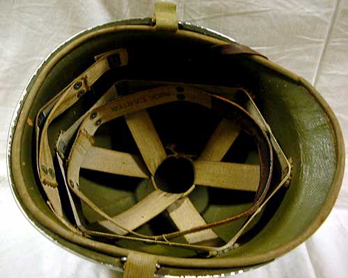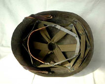 | 初期型ファイバーライナーのファーストタイプ内装。ベースとパーツウェビングは、共にレイヨン製でホック固定式。また、チンストラップは取り外しできない固定式でサイズ調整可能なバックルを附加している。この内装パターンの一部または全部が後に採用される別材質のライナー2種にも流用される。本体内側のファイバーにはODペイントが施された。 | レイヨン製ウェビングのスエットバンドとネックバンドにはサイズがあり、着用者に合わせた物を装着していた。 また、ワッシャーはノーペイントのストレイト型が用いられた。この内装はリッデルスタイルインテリアと呼ばれる。チンストラップは幅が狭く、耐久性にも乏しかった。また、チンストラップ基部の取付けにはウェビングの取り付けに用いられているリベットが流用された。 |